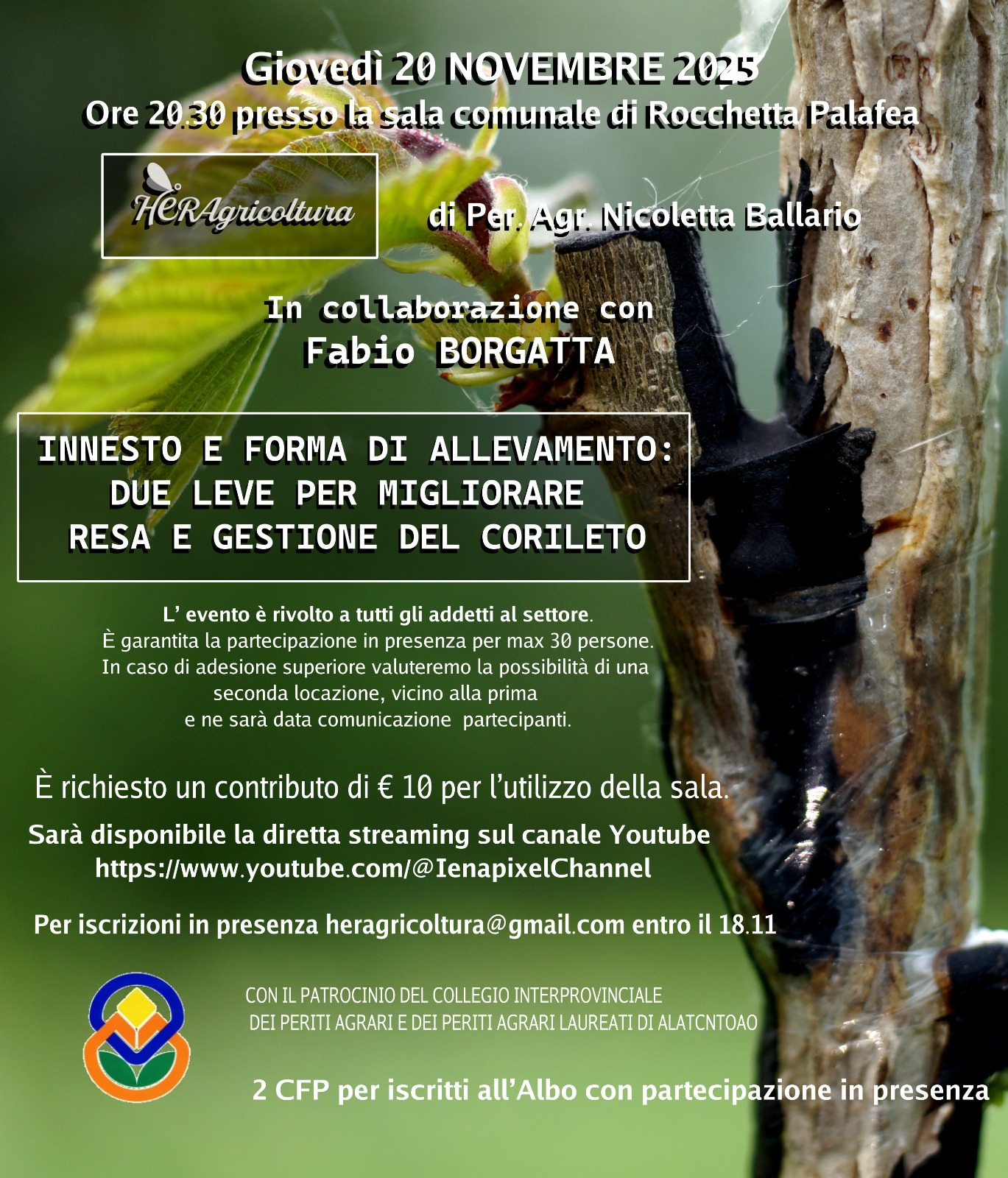 3. HERAgricoltura. “INNESTO E FORMA DI ALLEVAMENTO: DUE LEVE PER MIGLIORARE RESA E GESTIONE DEL CORILETO” - 20 novembre 2025. Evento patrocinato dallo scrivente Collegio Interprovinciale, si terrà alle 20.30 presso la sala comunale di Rocchetta Palafea – AT. La locandina con i dettagli è disponibile qui in allegato.