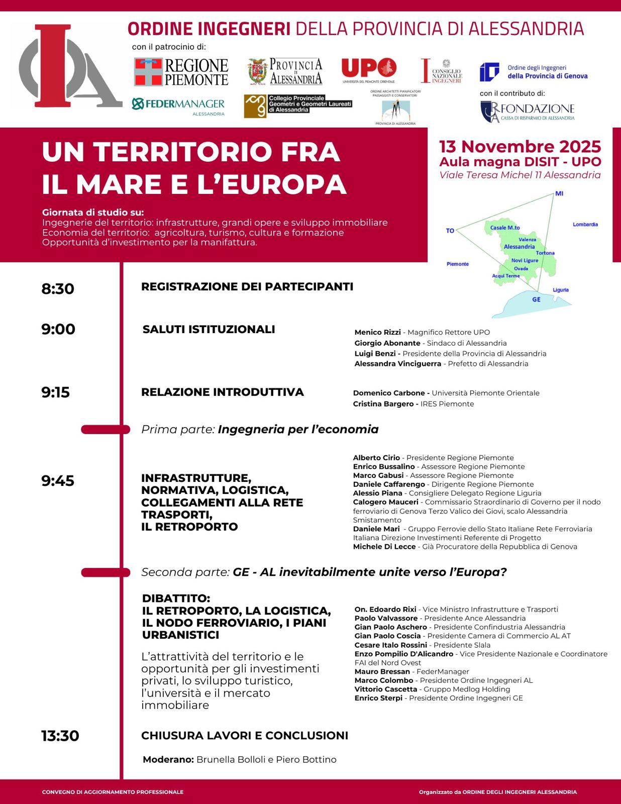 7. ORDINE DEGLI INGEGNERI DELLA PROVINCIA DI ALESSANDRIA: evento: un territorio fra il mare e l'europa – 13 Novembre 2025. La locandina con i dettagli è disponibile qui in allegato.